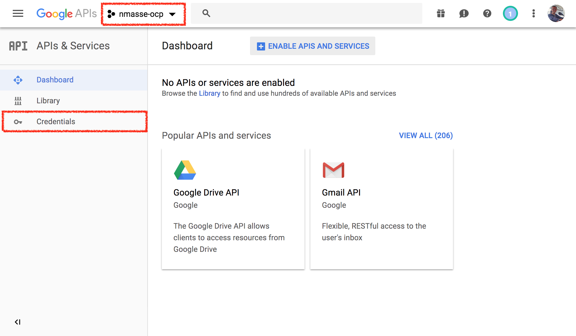 • Make sure your newly created project is selected in the top left corner and click on credentials in the left sidebar. Click on credentials