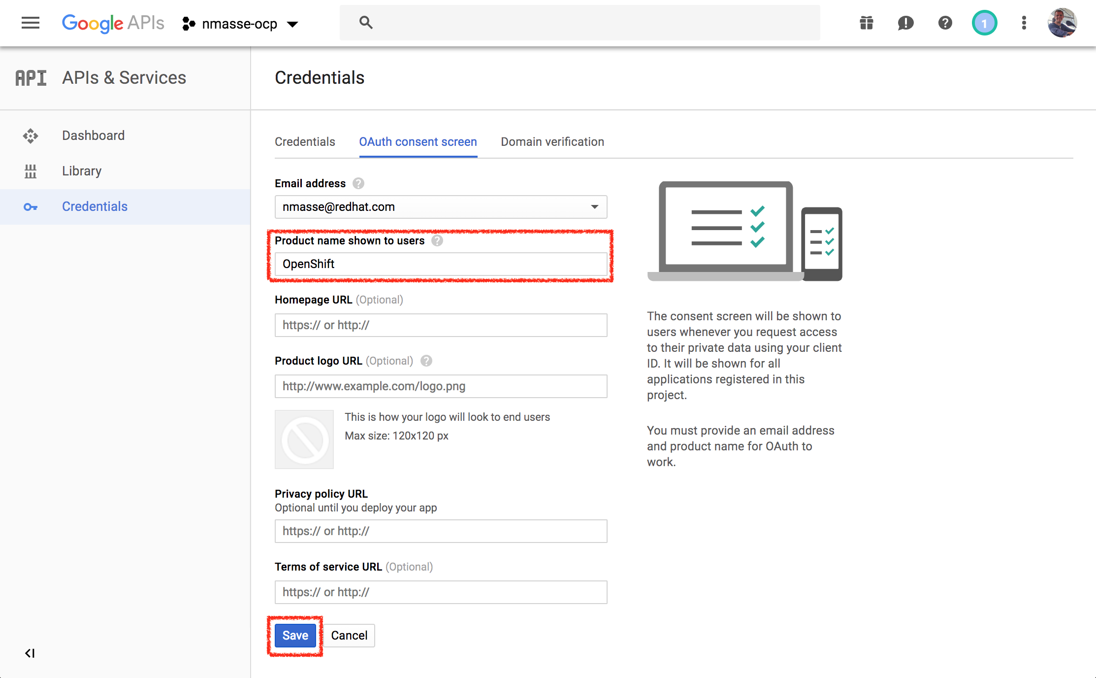 • In the product name, type something meaningful such as OpenShift and click Save. Choose a product name and click save